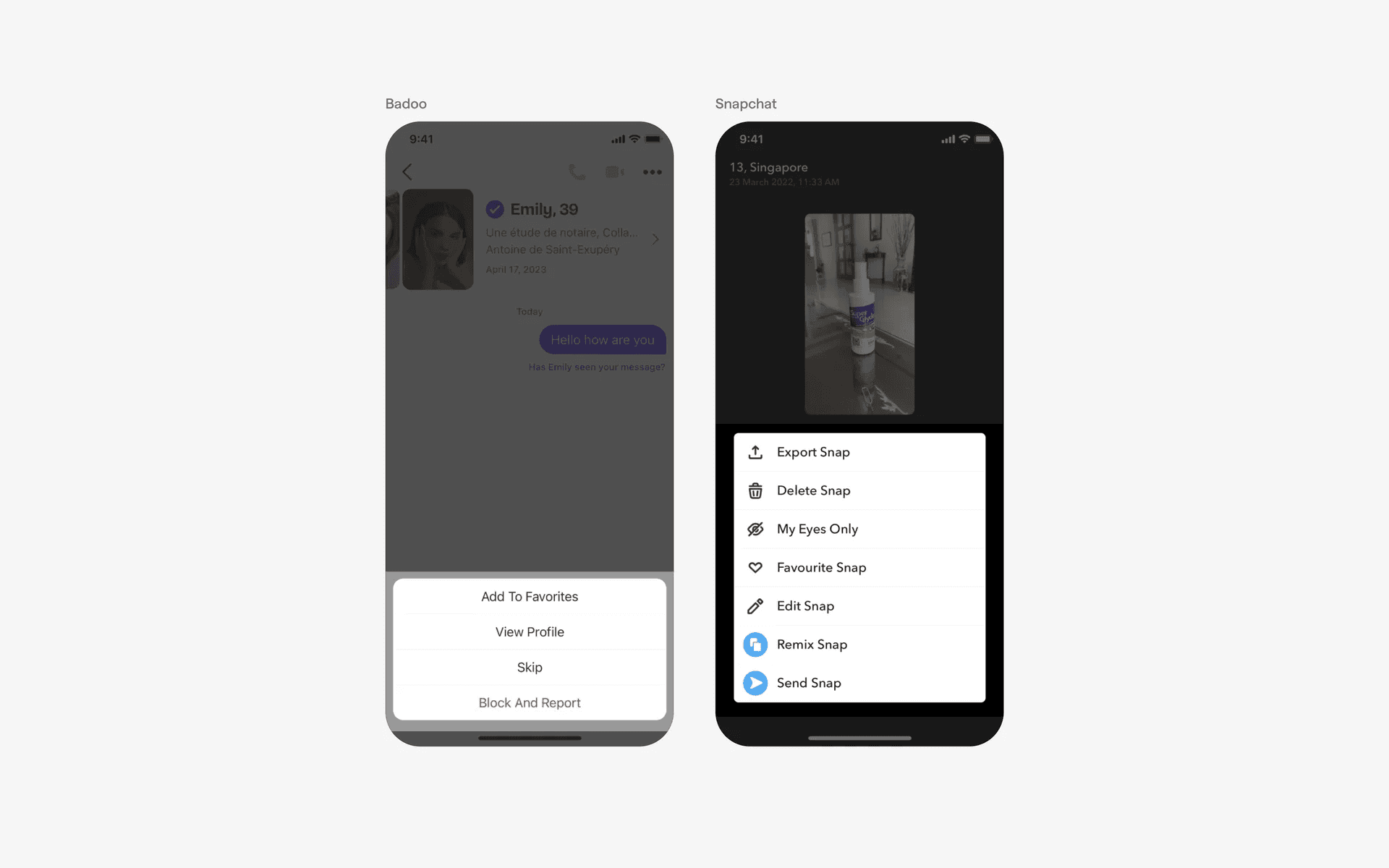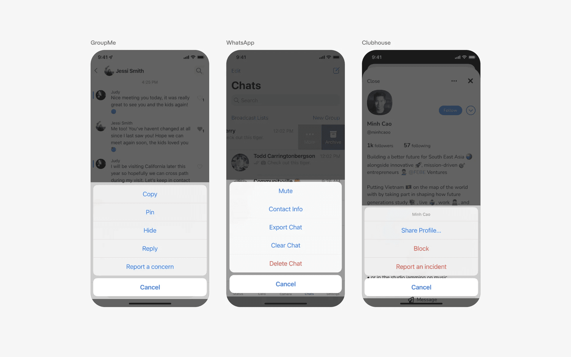 Example of action sheet in menu options - Note the red color on destructive actions like 'Block', 'Report', 'Delete'
