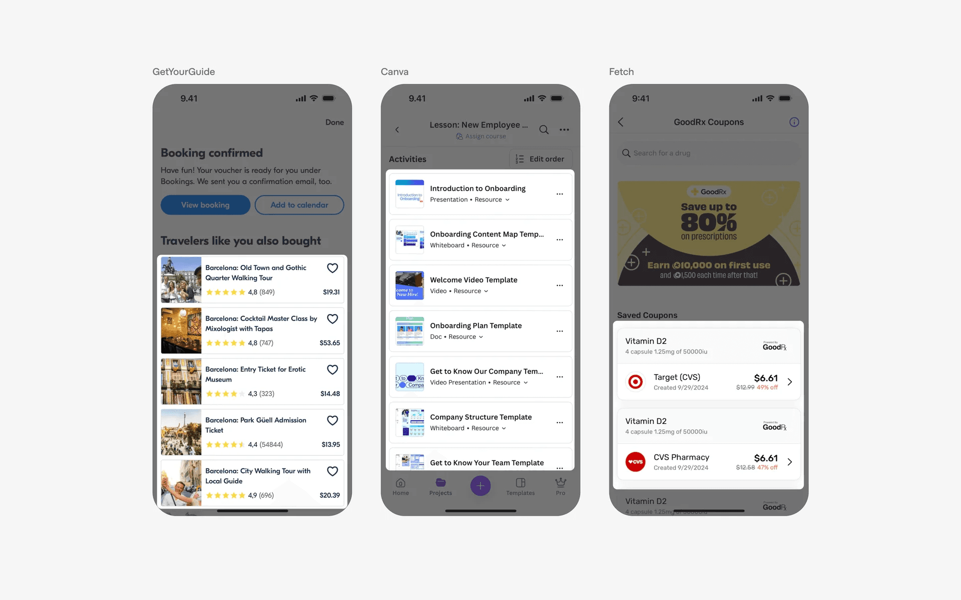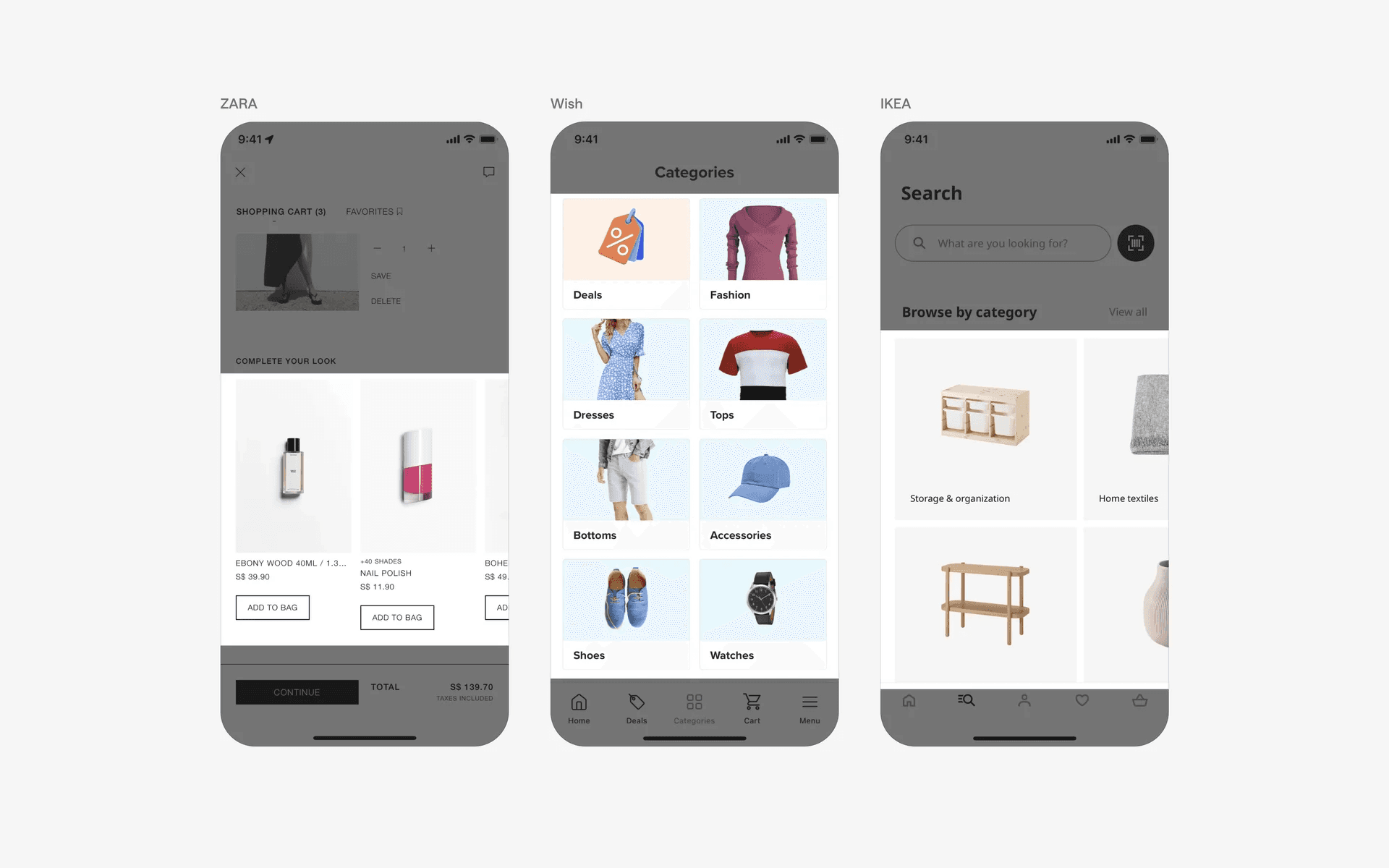 Examples of UI cards in product listings and e-commerce apps
