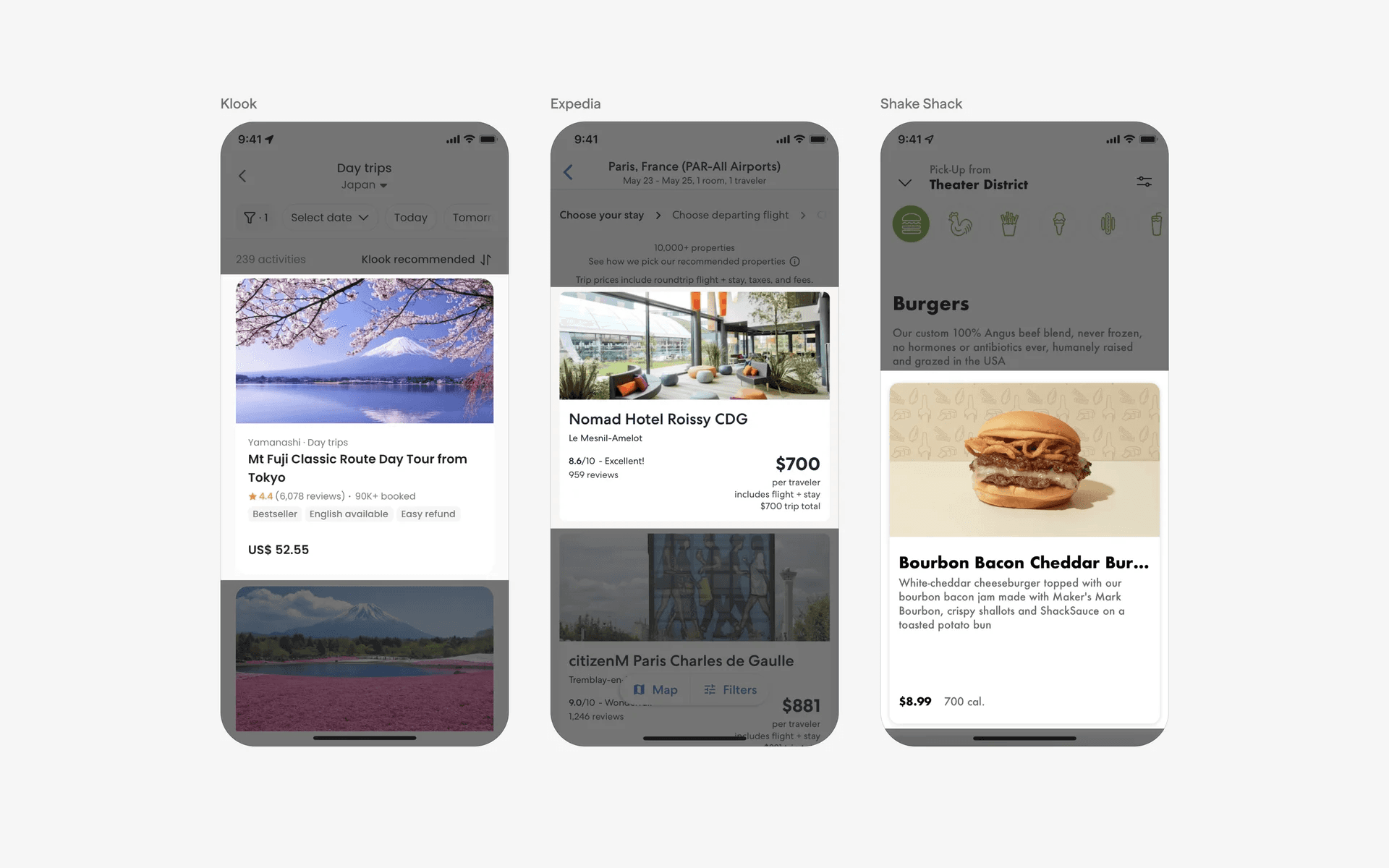 Apps like Klook, Expedia & Shake Shack have a medium thumbnail size. They give roughly 50% weightage to visuals and the other 50% to text elements that might be important for users.