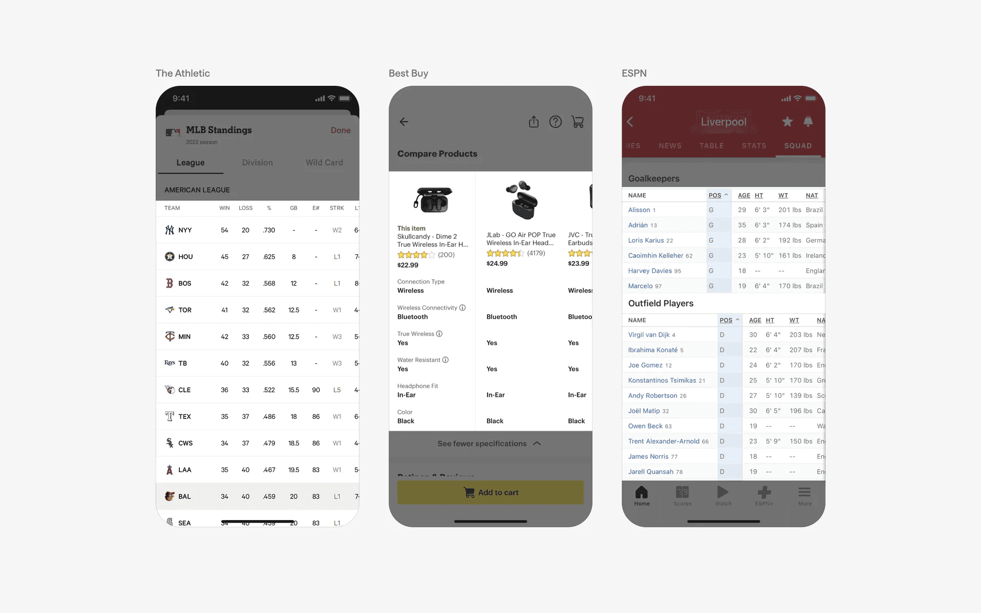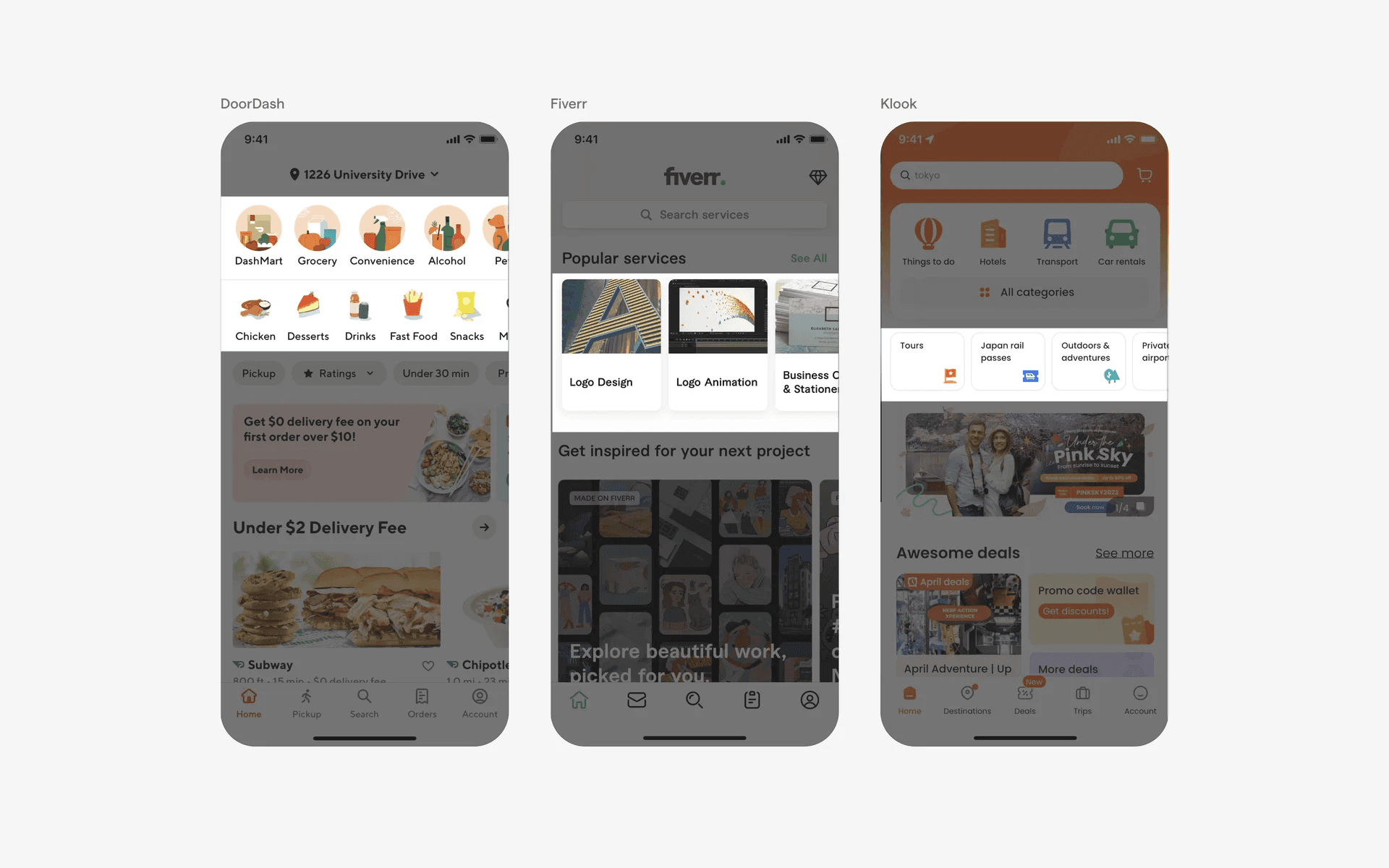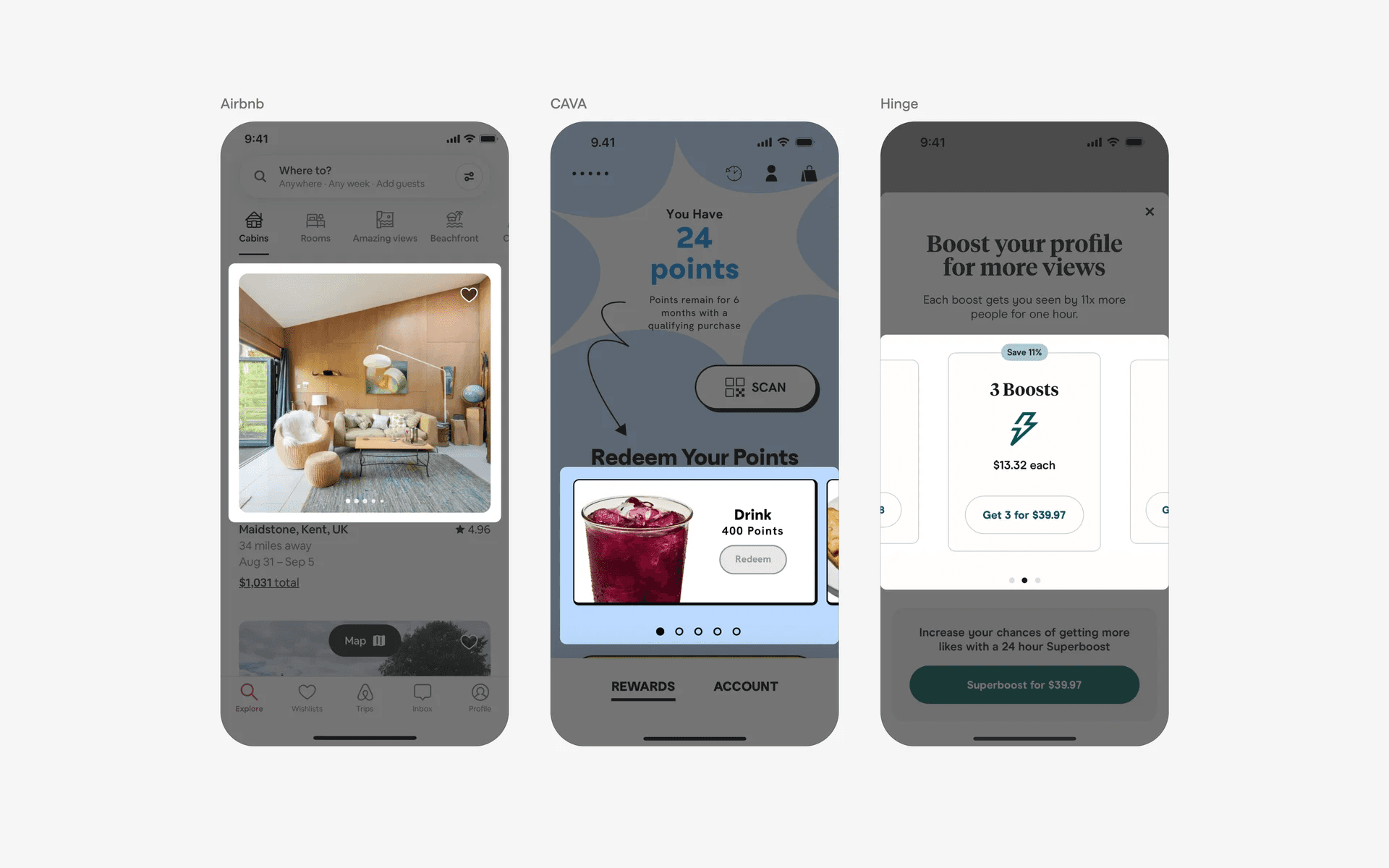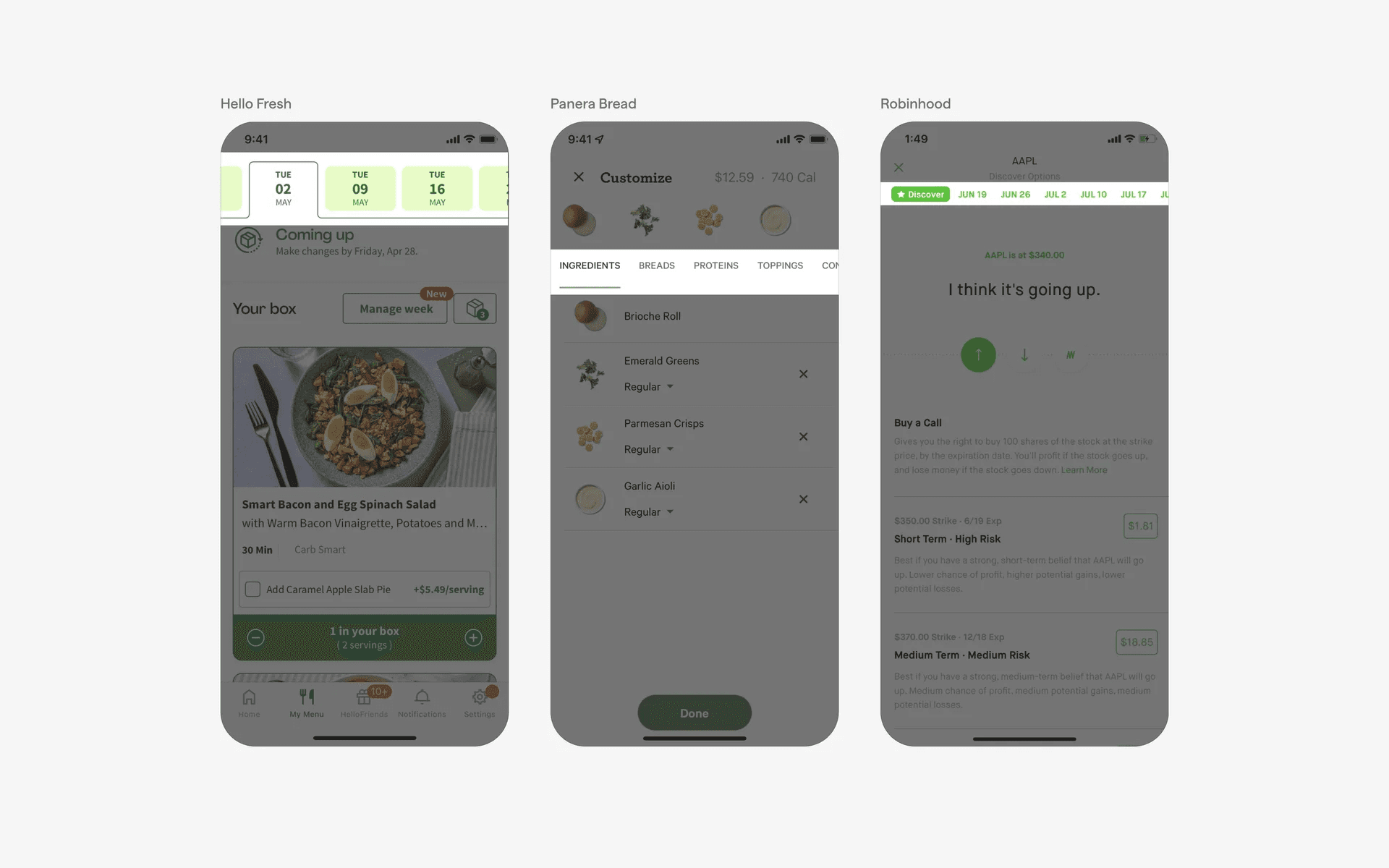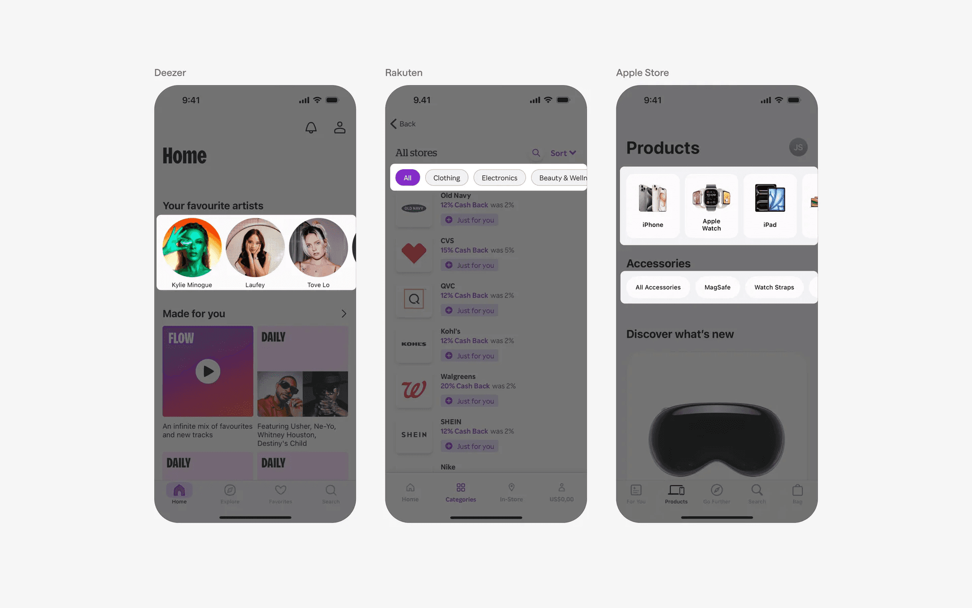 Apps that are visually focused usually place their products or services front and center, preferring to use a large carousel card design. Example brands include Apple and Hims.