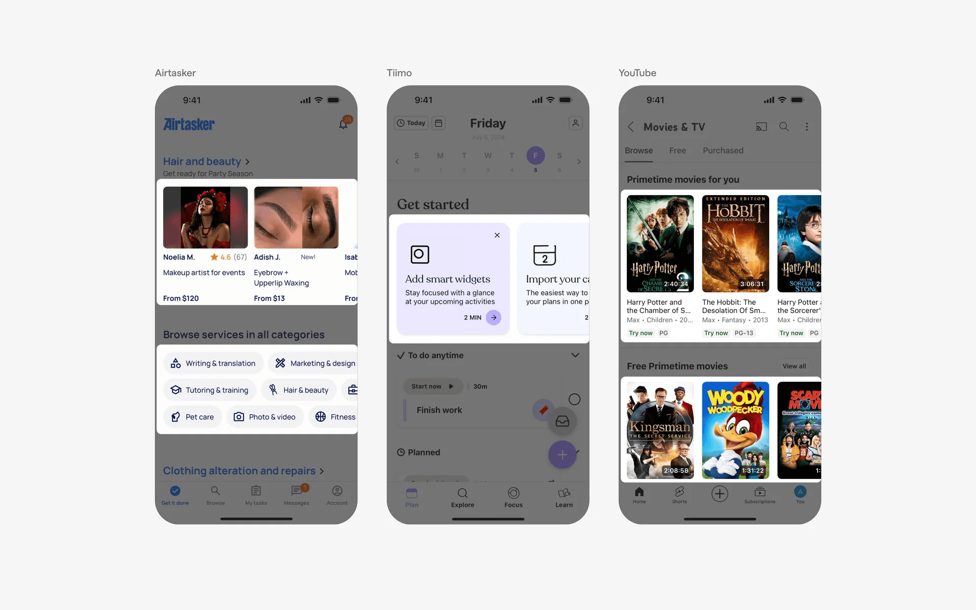 On the home screens of apps, carousels may be used to categorise content. They are often used together with cards, where users can swipe through the carousel to explore different categories of the app.