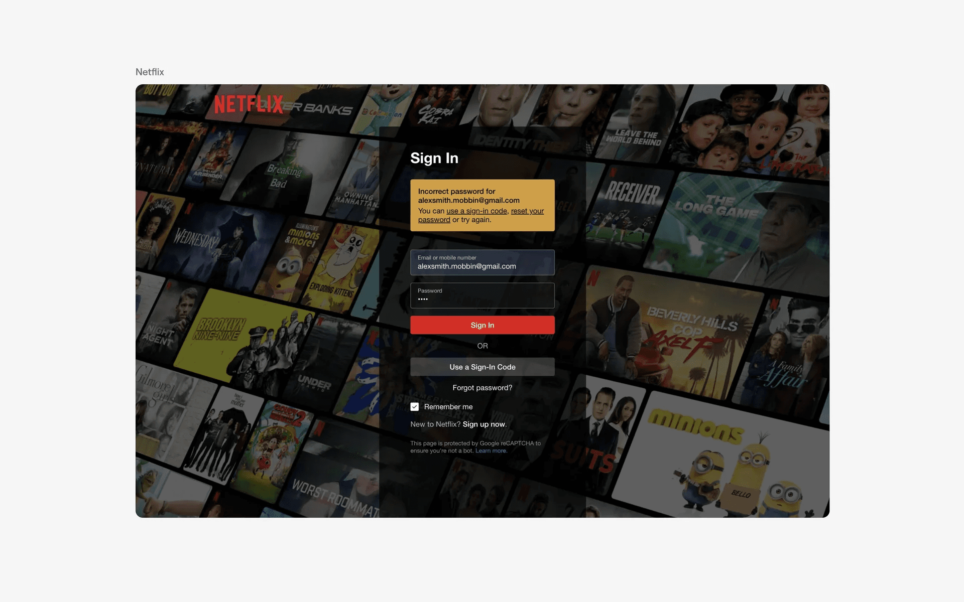 Next, you'll notice that the banner background color is yellow instead of the more commonly used red color. This is likely because Netflix's primary button is already using the red accent - and a yellow error banner message is more suitable in drawing attention in this context.