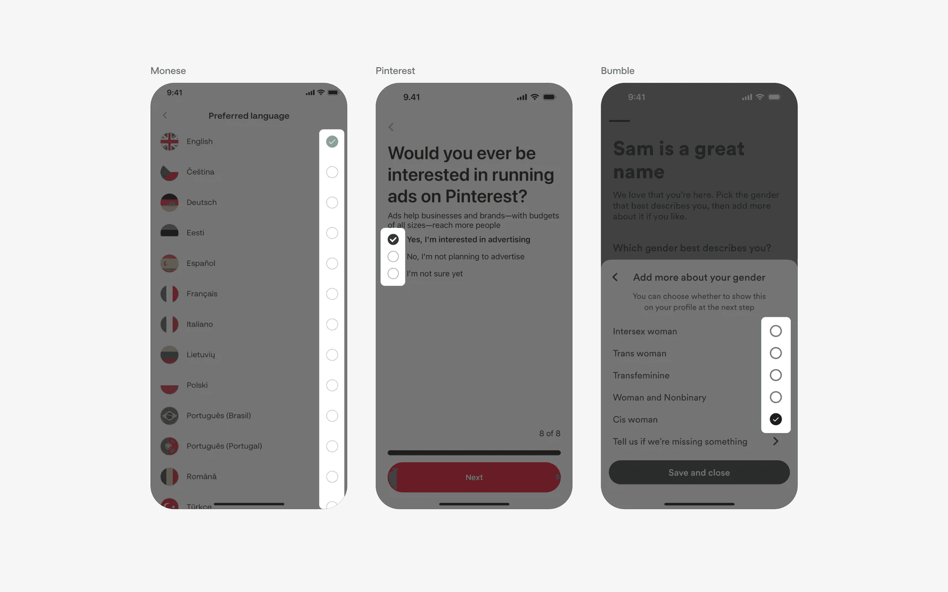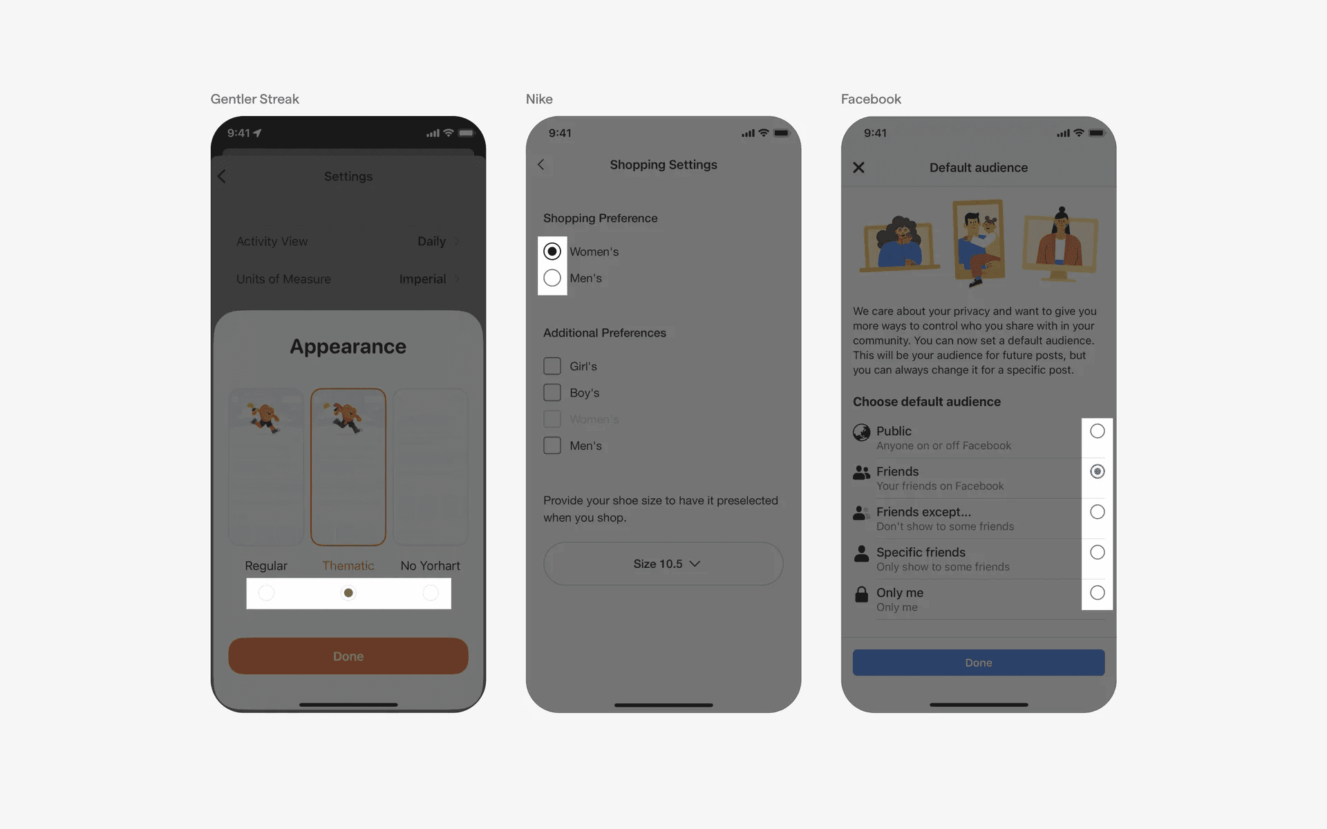 Examples of radio buttons in settings & preferences screen