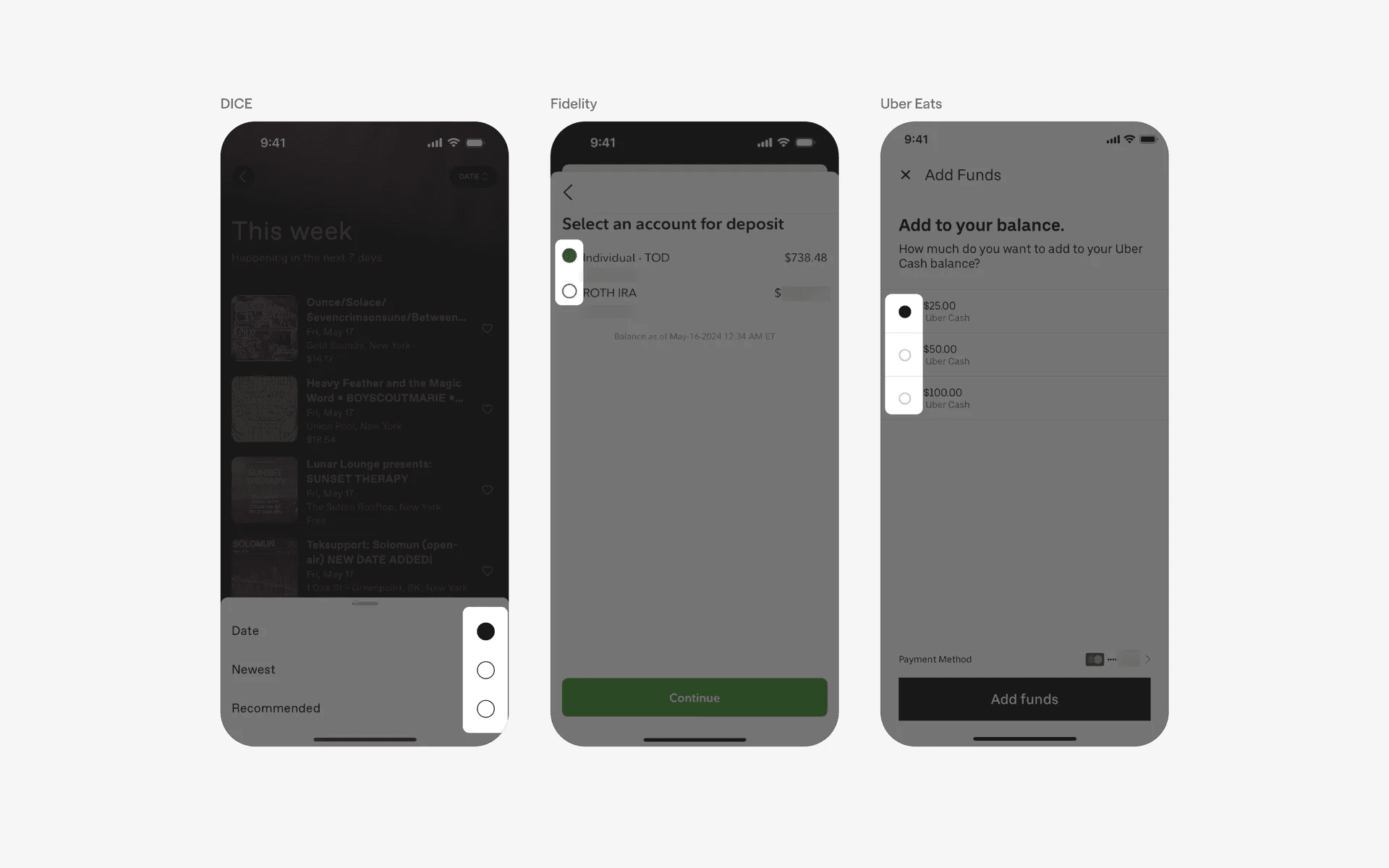Radio button UI elements are commonly seen in the following design patterns: Form inputs, Filter & sorting, Settings & preferences.