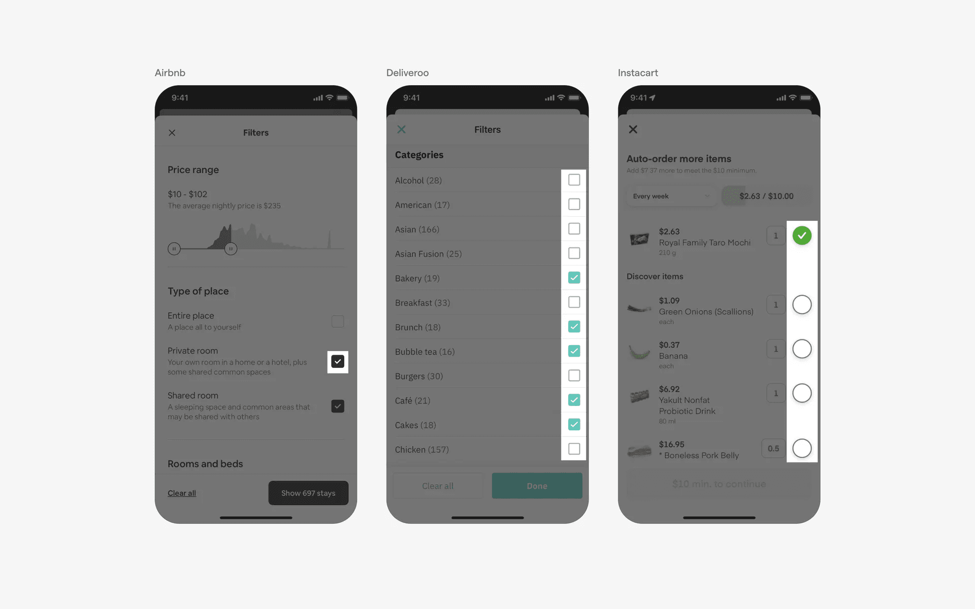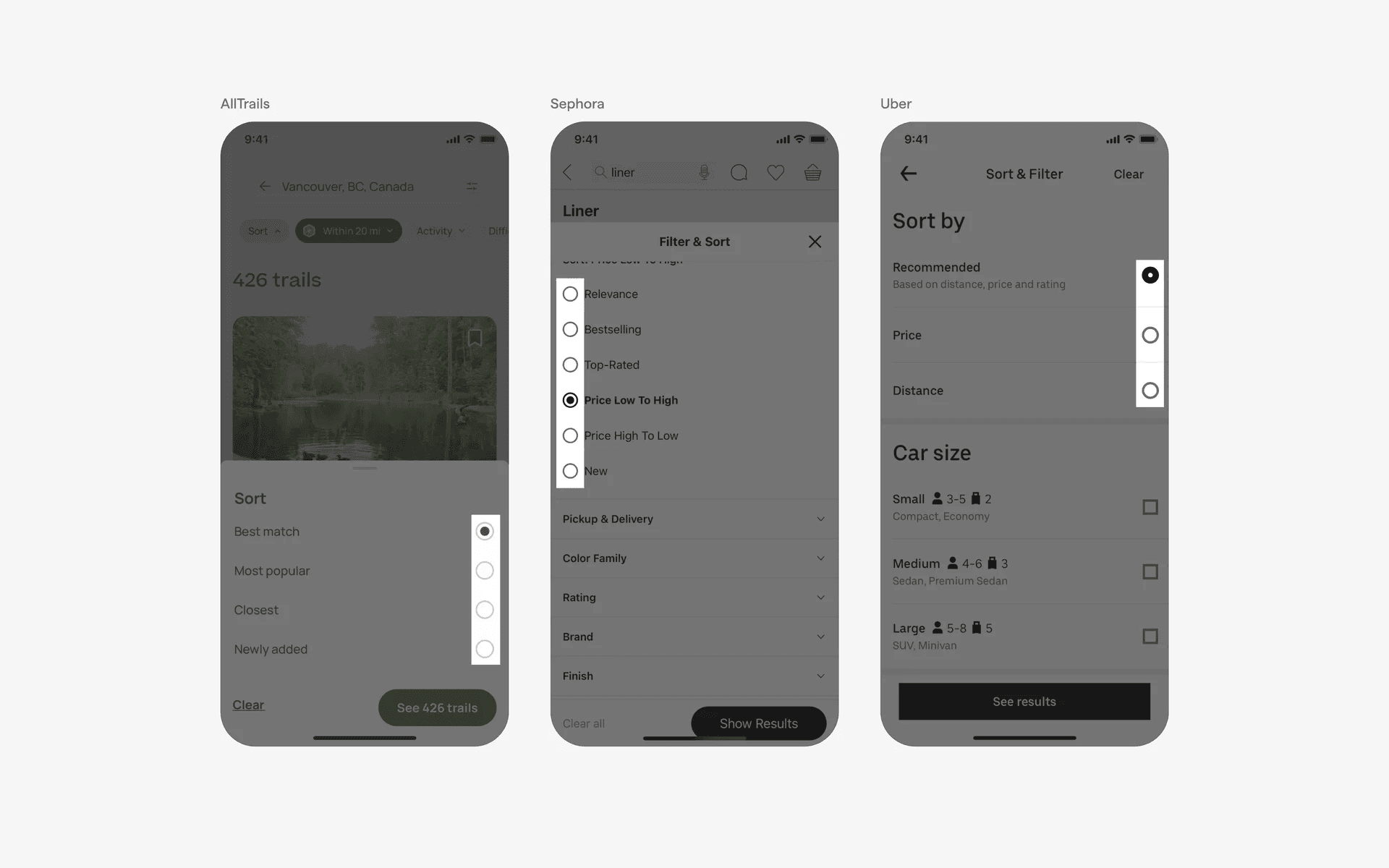 Examples of radio buttons in filters & sorting screen
