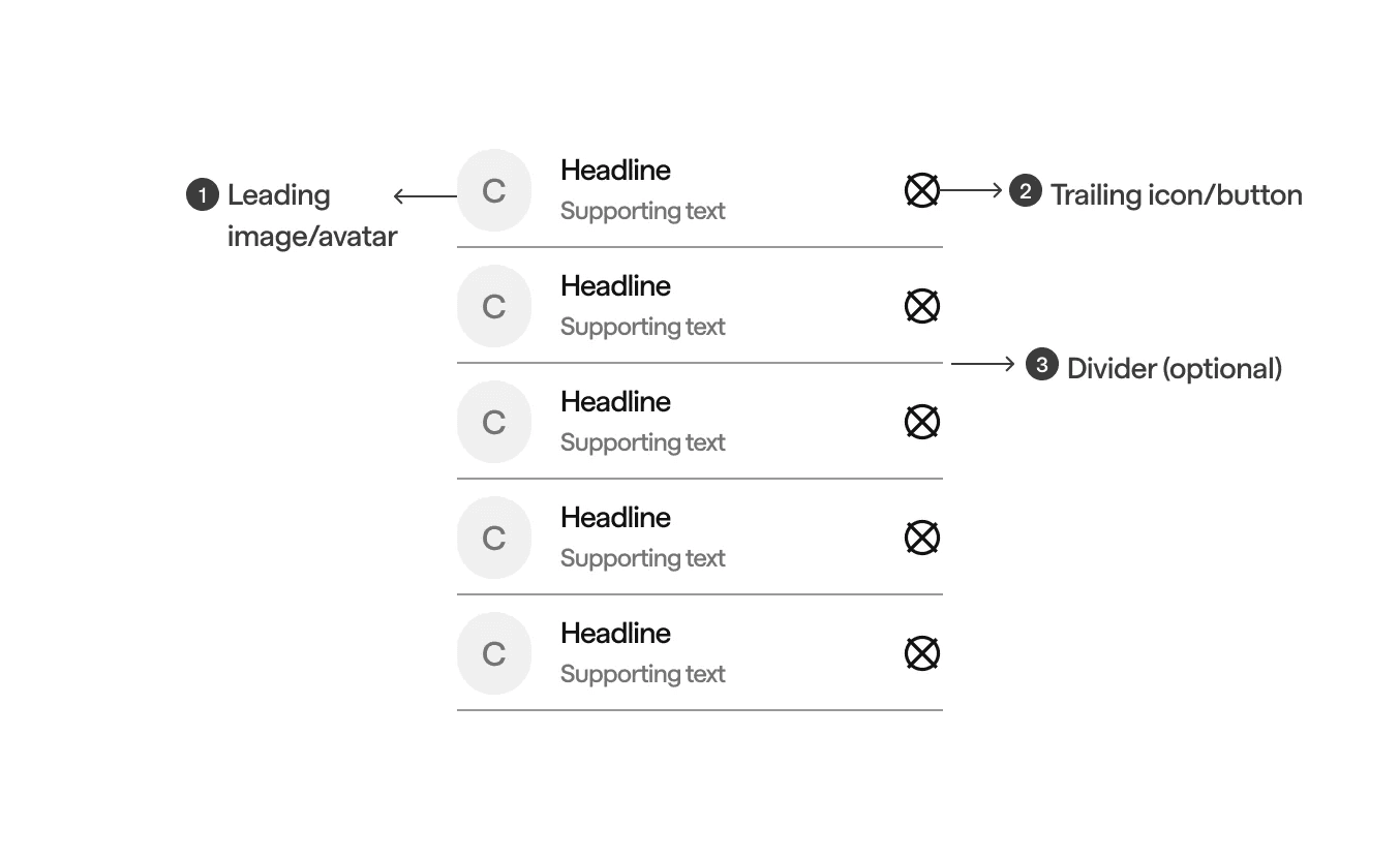 Standard stacked lists have a simple layout with minimal separation between items. It is often separated by a divider component.