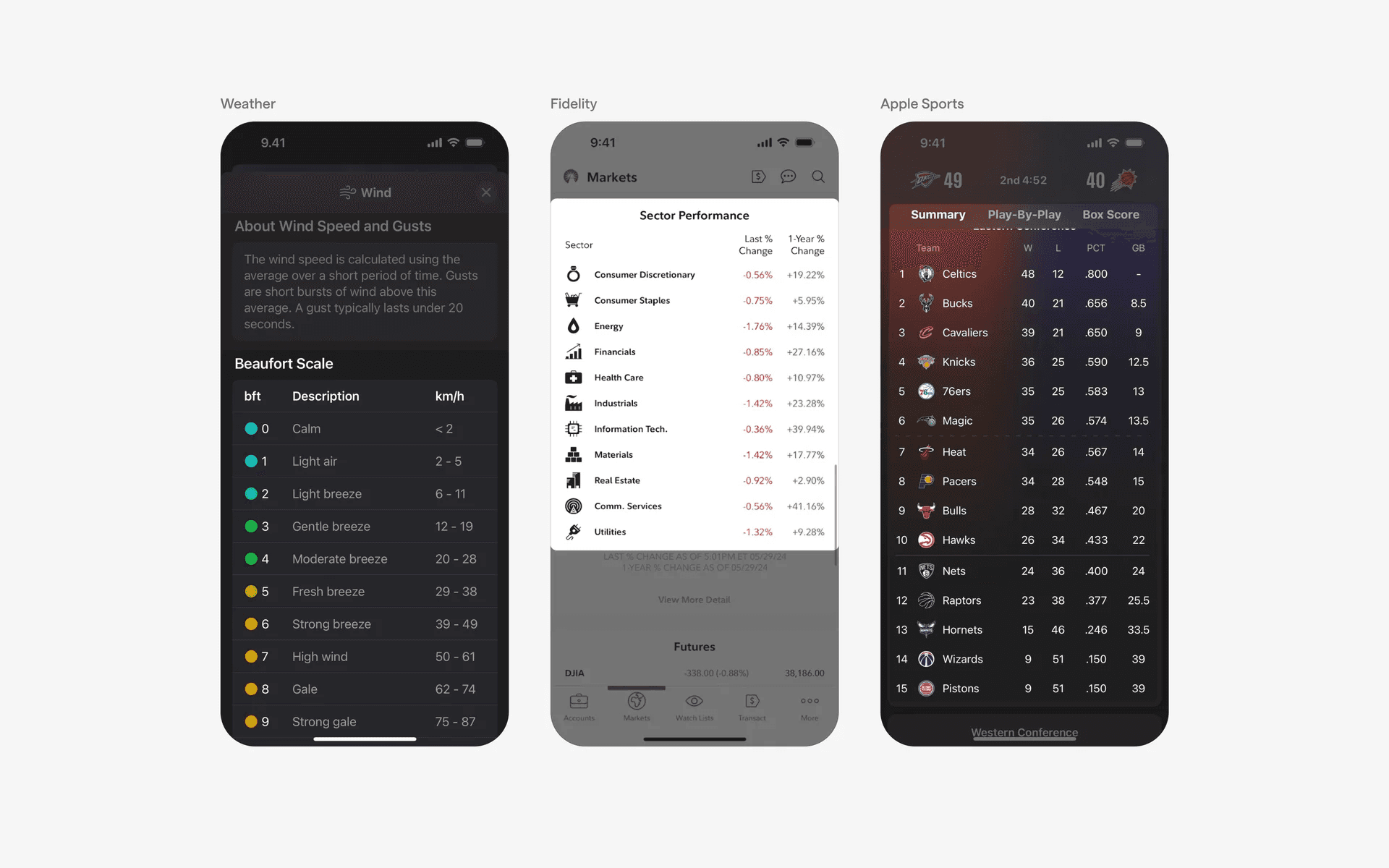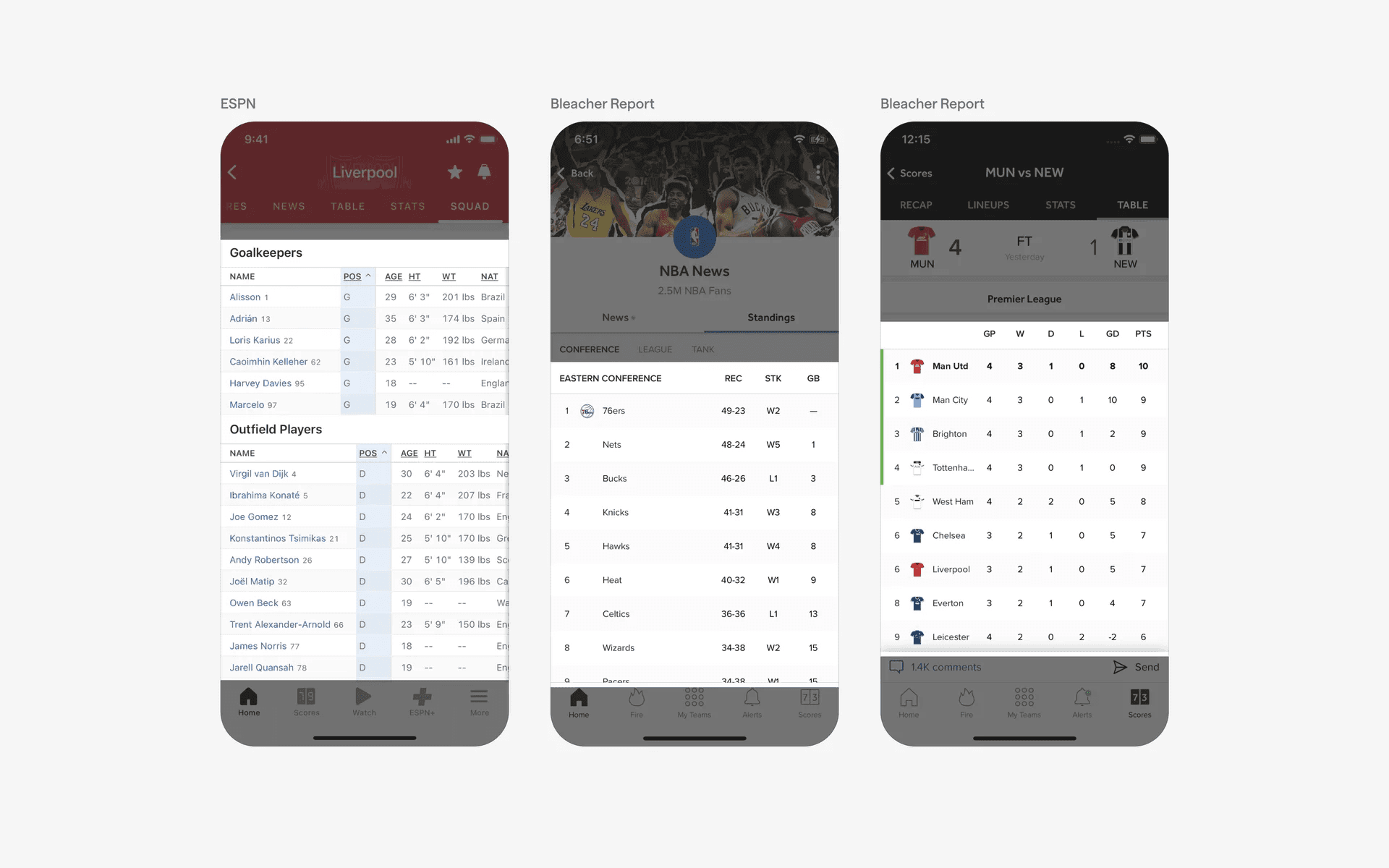 Examples of table UI in sports statistics & results