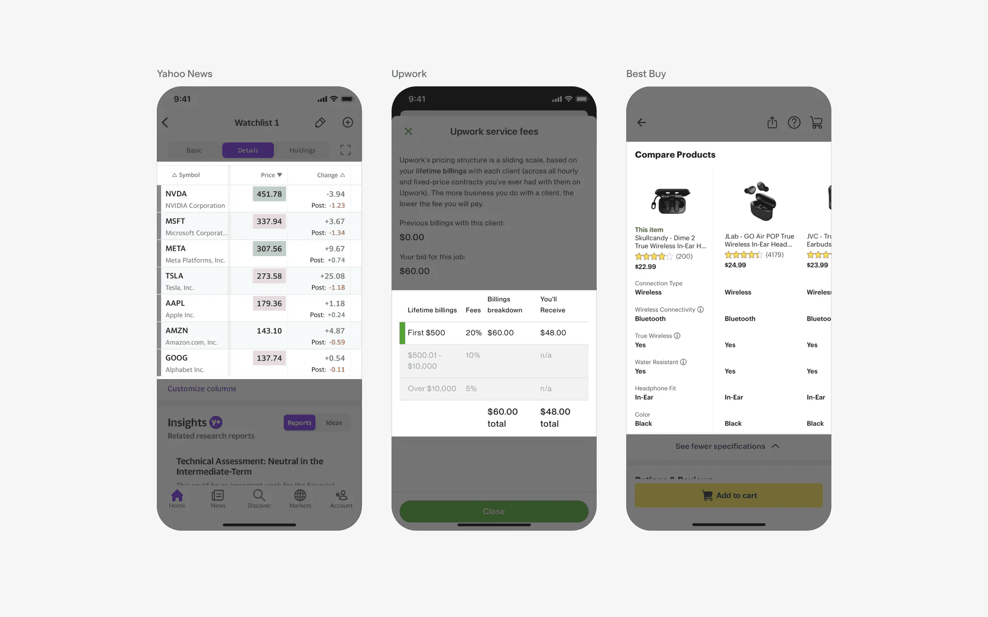Examples of table UI in features & information sections