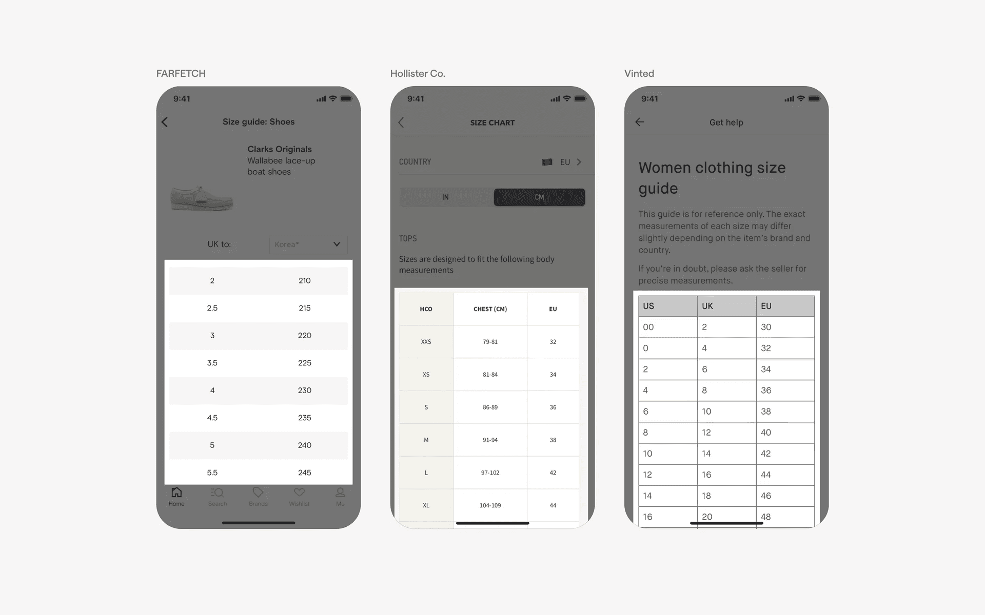 Examples of table UI in size guides